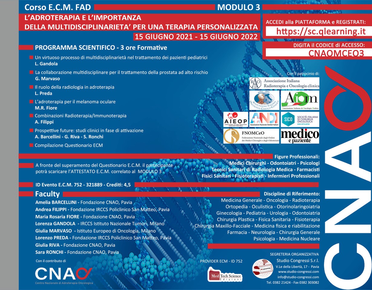 L’ADROTERAPIA E L’IMPORTANZA DELLA MULTIDISCIPLINARIETÀ PER UNA TERAPIA PERSONALIZZATA – Modulo 3 (CNAO_FAD_MMG/21)